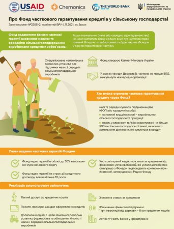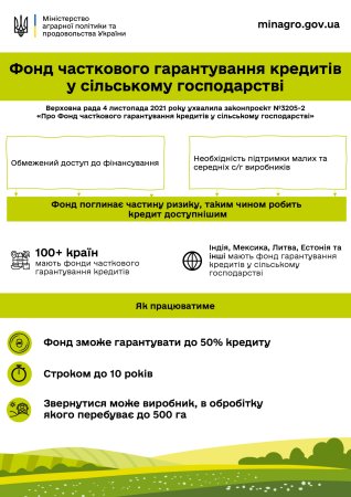 Законопроект визначає правовий статус та засади діяльності Фонду часткового гарантування – завдяки йому фермери, які обробляють до 500 га, матимуть гарантію від держави для отримання кредитів у фінустановах.