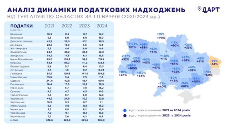 Загалом, у порівнянні з першим півріччям 2023 році ріст податкових надходжень в туристичній галузі зафіксовано в усіх областях України, окрім Луганської.