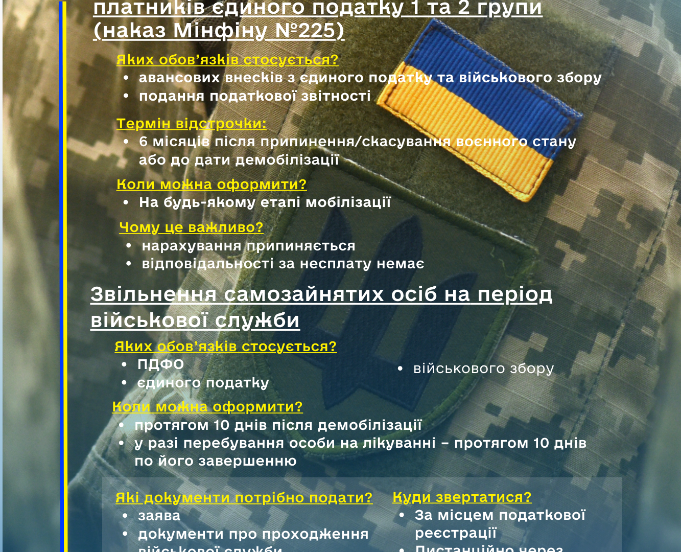 Самозайняті особи (фізичні особи – підприємці, особи, які провадять незалежну професійну діяльність), які мали або не мали найманих працівників, призвані на військову службу під час мобілізації або залучені до виконання обов’язків щодо мобілізації за посадами, передбаченими штатами воєнного часу, під час особливого періоду, визначеного Законом України «Про мобілізаційну підготовку та мобілізацію», на весь період їх військової служби звільняються від обов’язку нарахування, сплати та подання податкової звітності з податку на доходи фізичних осіб, також звільняються від обов’язку нарахування, сплати та подання податкової звітності з єдиного податку, а також звільняються від обов’язку нарахування, сплати та подання звітності з військового збору у складі податкової звітності з податку на доходи фізичних осіб або єдиного податку.