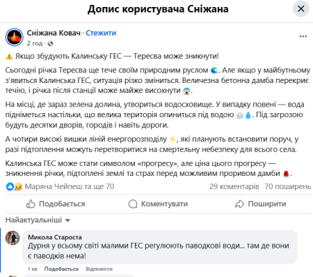 На тлі цих "страшилок" думки розділилися. Деякі користувачі підтримують ці побоювання, поширюючи їх як заклик до дії, щоб запобігти екологічній катастрофі. Водночас, інші, як-от Микола Староста, звертають увагу на те, що малі ГЕС у всьому світі часто будують саме для регулювання паводкових вод, що є актуальною проблемою для Закарпаття.