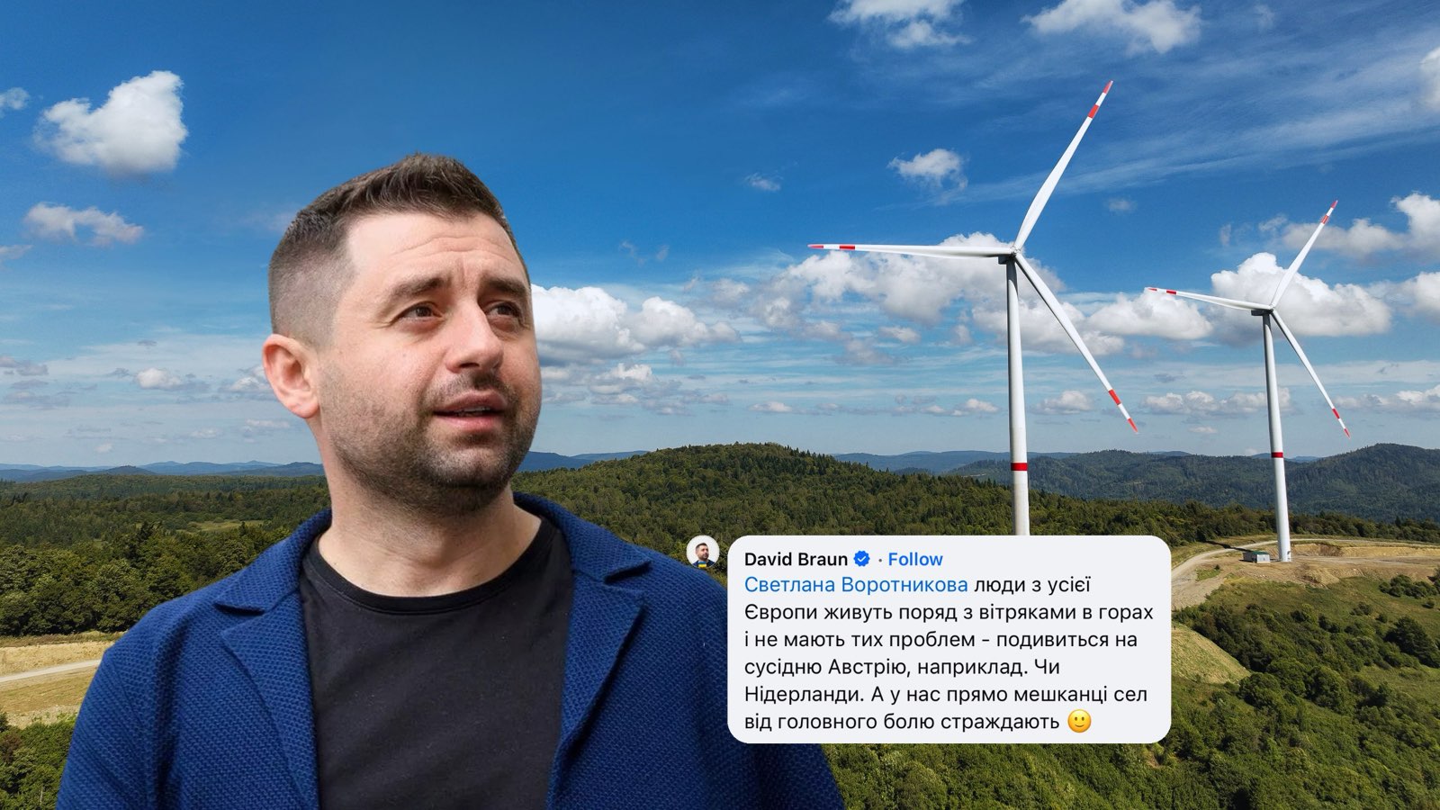 «Люди з усієї Європи живуть поряд з вітряками в горах і не мають таких проблем — подивіться на сусідню Австрію, наприклад. Чи Нідерланди. А у нас прямо мешканці сіл від головного болю страждають», — написав нардеп, реагуючи на коментар про нібито шкоду вітряків.