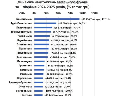 Динаміка надходжень до Загального фонду місцевих бюджетів показала, що деякі малі громади зробили потужний фінансовий стрибок. Абсолютним лідером за відсотковим зростанням стала Тур’є-Реметівська ТГ, яка подвоїла свої надходження.