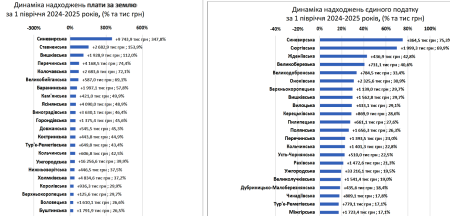 Окремої уваги заслуговує динаміка надходжень плати за землю. Тут Синевирська ТГ встановила абсолютний рекорд, показавши зростання понад +600% (+9,7 млн грн). Це може бути результатом успішної інвентаризації земель або запровадження ефективних механізмів збору плати.