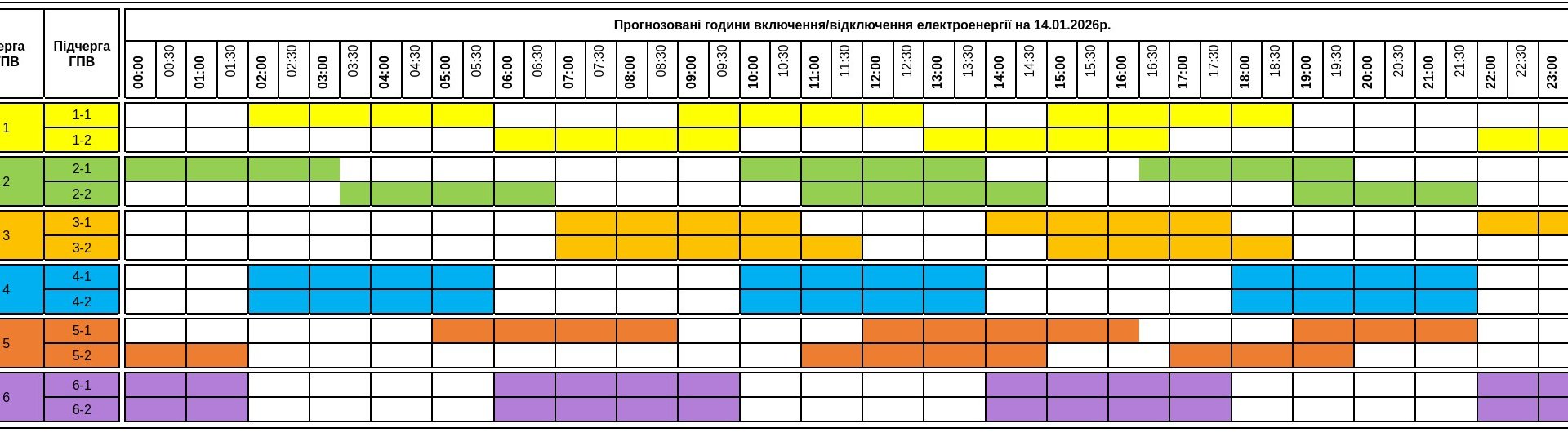 АТ «Закарпаттяобленерго» оприлюднило оновлений прогнозований графік погодинних включень та відключень електроенергії для споживачів області на середу, 14 січня 2026 року.