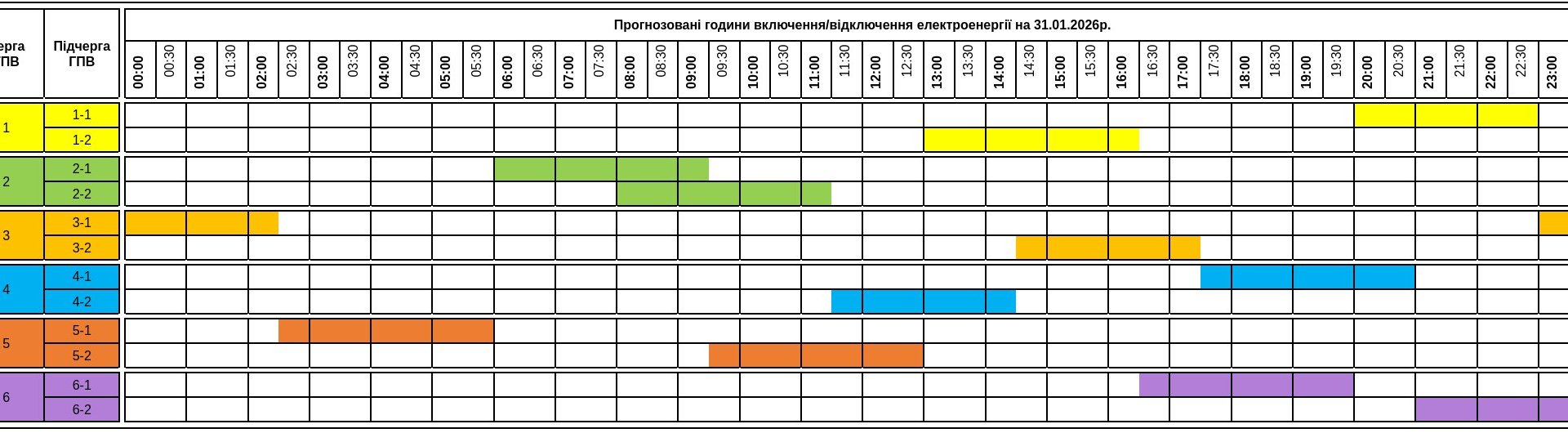 До уваги споживачів графік погодинних включень/відключень електроенергії на 31.01.2026.