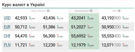 Долар (USD): купівля — 43,30, продаж — 44,00–44,15 грн.