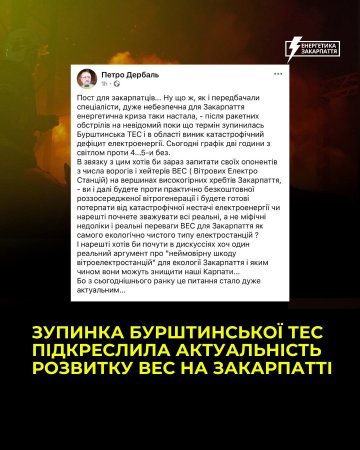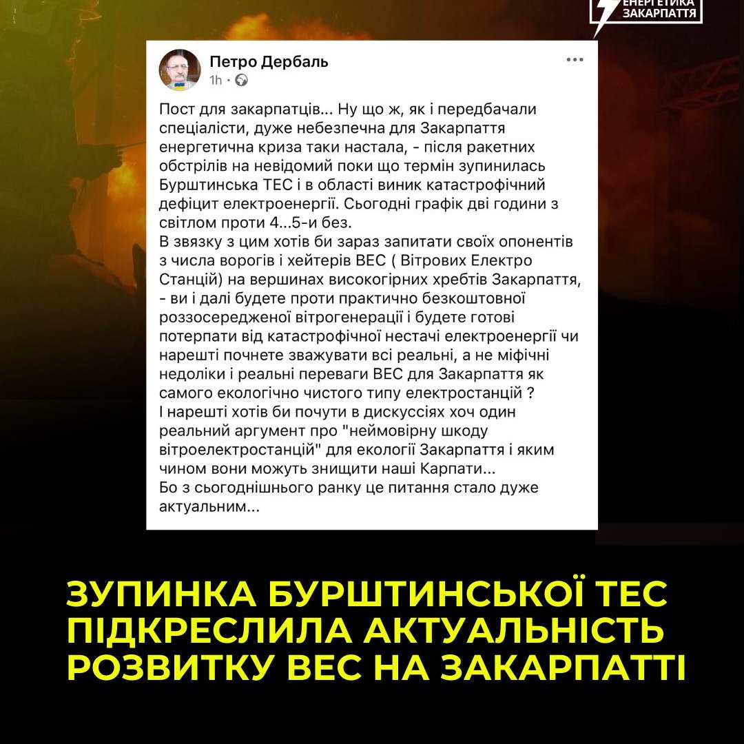 На тлі цієї кризи в соціальних мережах активно обговорюють необхідність розвитку власної генерації. Користувачі наголошують на перевагах розподілених джерел енергії, як-от вітрові станції, які важче пошкодити атаками. Один з постів у X від Петро Дерфана підкреслює: "Зупинка Бурштинської ТЕС і обстріли на невизначений період підкреслюють актуальність розвитку ВЕС на Закарпатті".