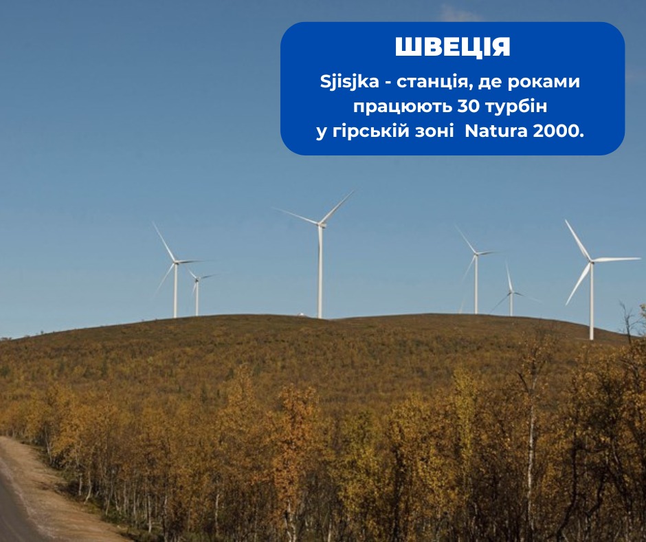 У Швеції, в північних регіонах Лапландії, діє вітропарк Sjisjka, розташований у гірській місцевості поруч із територіями Natura 2000. Під час планування враховували сезонну міграцію північних оленів і птахів, а також особливості арктичної екосистеми. Проєкт був дозволений після оцінки впливу, що ще раз підтверджує: ключовим є не статус території сам по собі, а результат екологічного аналізу.