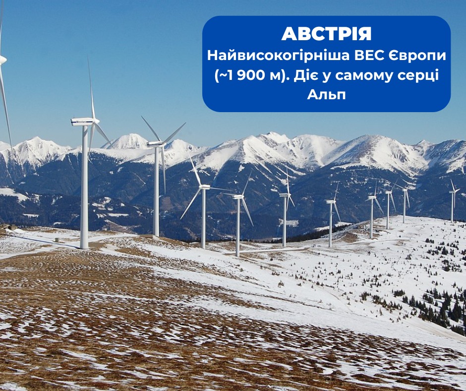 В Австрії у високогір’ї Альп реалізовано проєкти вітроенергетики на висотах до 1900 метрів, зокрема в районі Tauern. Ці території мають природоохоронне значення, однак не є повністю закритими для господарської діяльності. Будівництво стало можливим після проходження процедур оцінки, що включали вплив на ландшафт, туризм і фауну.