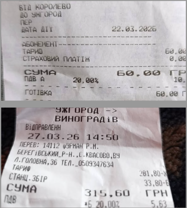 Автобус Виноградів — Ужгород: 315,60 грн (ціна, що у п'ять разів перевищує залізничну).