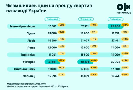 Згідно з даними аналітичного звіту OLX Нерухомість, саме Ужгород став абсолютним рекордсменом за темпами зростання вартості оренди серед усіх обласних центрів Західної України. Якщо порівнювати березень 2026 року з аналогічним періодом минулого року, цифри вражають навіть досвідчених рієлторів.