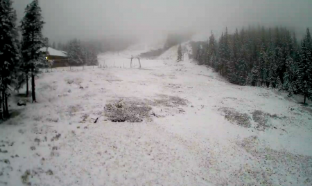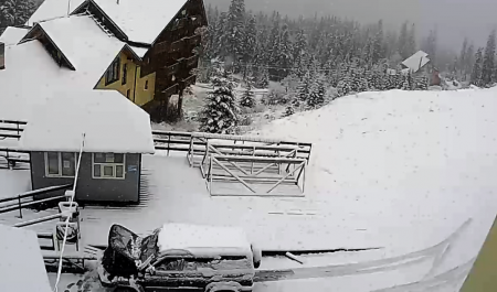 На фото - гірськолижний курорт «Драгобрат», в Рахівському районі, де минулої ночі знову випав сніг температура повітря, опустилася до позначки – 2 градуси морозу. За пронозами синоптиків в наступні дні тут випаде до 10 сантиметрів снігу.
