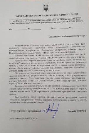 Тому керівництво області звернулося до прокуратури розпочати кримінальне провадження і розслідувати факт невиплати зарплати керівництвом Воловецької лікарні.