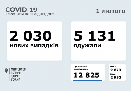 2030 нових випадків коронавірусної хвороби COVID-19 зафіксовано в Україні станом на 1 лютого 2021 року. Зокрема, захворіли 71 дитина та 65 медпрацівників.