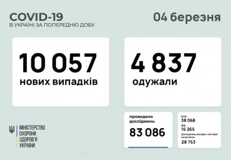 10 057 нових випадків коронавірусної хвороби COVID-19 зафіксовано в Україні станом на 04 березня 2021 року. Зокрема, захворіли 611 дітей та 388 медпрацівників.
