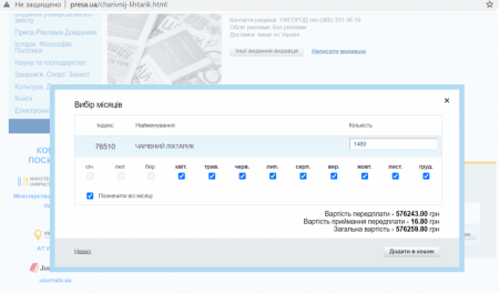 Район.Мукачево поцікавився на сайті Державного підприємства по розповсюдженню періодичних видань «ПРЕСА», яка ж місячна вартість передплати журналу «Чарівний ліхтарик» для звичайного українця. Ми спробували оформити замовлення такої ж кількості журналів на сайті. Загальна вартість замовлення вийшла 576259.80 грн, це вже із доставкою та поштовими послугами. Вартість одного примірника - 43 грн.