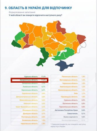 Згідно соціологічного опитування 11.8% українців, які поїдуть на відпочинок приїдуть на Закарпаття, це другий показник після Одеської області.