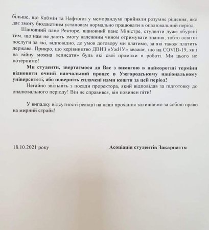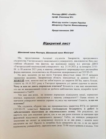 З таким повідомленням студенти звернулися до редакції Новин Закарпаття, та з проханням оприлюднити відкритий лист.