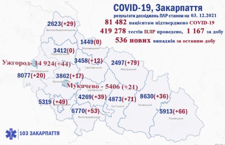 Загалом з початку пандемії у 81 482 закарпатців встановлено діагноз COVID-19, із яких – 4 049 медики та 5 063 діти. За минулу добу підтверджено COVID-19 у 536 осіб, з них – 10 медичних працівників та 49 дітей.