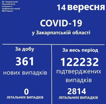 ДУ “Закарпатський обласний центр контролю та профілактики хвороб МОЗ України” повідомляє, що станом на 14.09.2022 року: