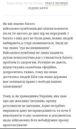 У петиції йдеться про надання обов'язкової ротації військовослужбовців після певного часу перебування на службі або відпустки задля отримання якісних медичних послуг за місцем проживання.