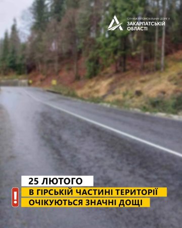 📣Синоптики попереджають: 25 лютого переважно в гірській частині території Закарпаття очікуються значні дощі