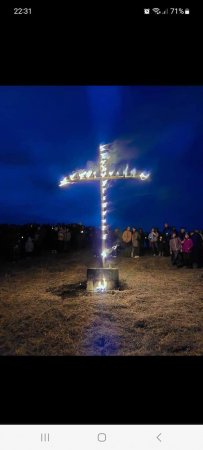 Вкінці цієї хресної дороги стоїть металевий Хрест, у який вставляються факели і запалюються. В часі цього вірні співають 50-тий псалом.