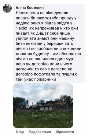 "Нічого вони не ліквідували писали би вже хотяби правду у неділю рано я пішла звідти у Чехію як непроживав ніхто они пиздят як дишат себе лише увиличати знают они машину бити нехотіли у берешки зато нічого і не зробили лиш походили довкола будинку там абсолютно нічого не лишилося один мур всьо як догоріло вони нічого негасили то саме погасло як догоріло пофоткали та пушли о такі унас пожарники". - коментує Аліна Костевич.