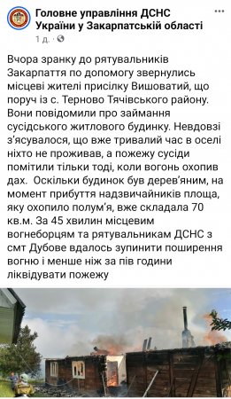 В мережі фейсбук, Аліна Костевич прокоментувала статтю щодо ліквідації пожежі на Тячівщині. Вчора Новини Закарпаття повідомляли про те що на Тячівщині горів будинок, за офіційною інформацією ДНСН у Закарпатській області.