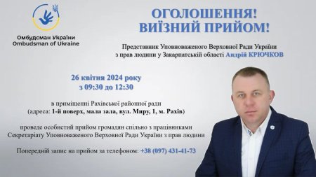26 квітня 2024 року у Рахові особистий прийом громадян буде здійснювати Андрій Крючков - Представник Уповноваженого Верховної Ради України з прав людини у Закарпатській області.