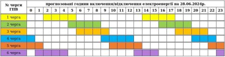 До уваги споживачів графік погодинних включень/відключень електроенергії на 28.06.2024
