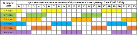 До уваги споживачів графік погодинних включень/відключень електроенергії на 13.07.2024