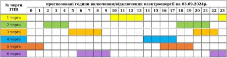 До уваги споживачів графік погодинних включень/відключень електроенергії на 03.09.2024