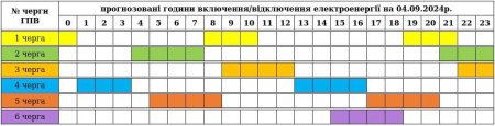До уваги споживачів графік погодинних включень/відключень електроенергії на 04.09.2024