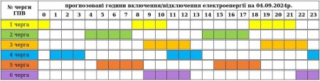 До уваги споживачів ОНОВЛЕНИЙ графік погодинних включень/відключень електроенергії на СЬОГОДНІ 04.09.2024