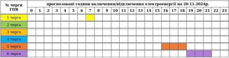 За розпорядженням диспетчера НЕК "Укренерго" сьогодні, 20 листопада, до 22:00 діятиме графік погодинних відключень електроенергії – одна черга. Відключення почали із 5 черги.