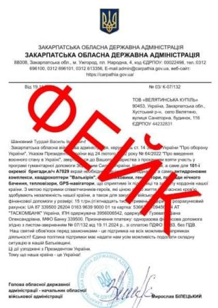 ✉️На адреси територіальних громад, підприємств надходять листи на фіктивному бланку Закарпатської ОВА з підробленим моїм підписом із проханням перерахувати кошти для підтримки армії.