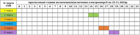 До уваги споживачів графік погодинних включень/відключень електроенергії на понеділок, 25.11.2024