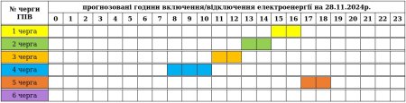 До уваги споживачів графік погодинних включень/відключень електроенергії на четвер, 28.11.2024