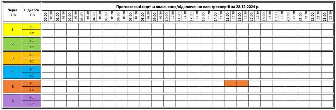 До уваги споживачів графік погодинних включень/відключень електроенергії на суботу, 28.12.2024