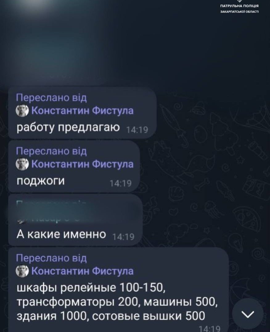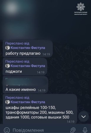 У Telegram-каналі йому пропонували "заробіток" за підпали релейних шаф, транспорту, трансформаторів, будівель та стільникових веж.