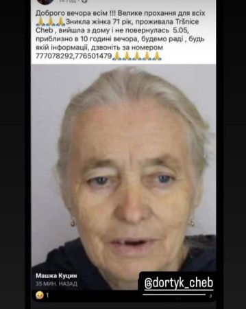 У місті Хеб (Чехія) зникла літня жінка родом із Закарпаття — село Терново, урочище Петрушів. Її ім’я наразі не розголошується, але відомо, що вона 71-річна, вже четвертий день не виходить на зв’язок, і про її місцезнаходження нічого невідомо.