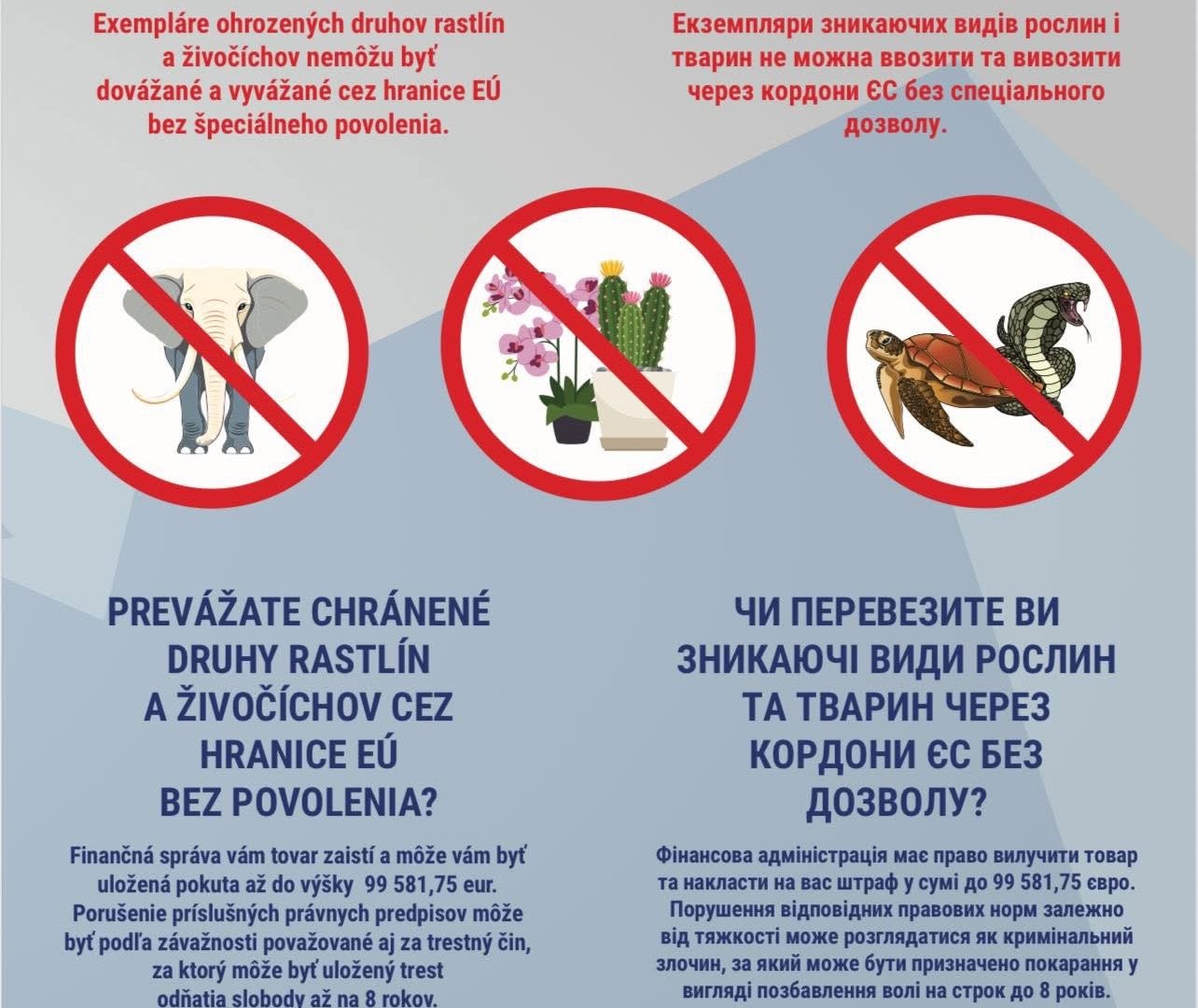 🦜 Увага до сувенірів! Заборонено ввозити чи вивозити екземпляри зникаючих видів тварин і рослин без спеціального дозволу. Порушення може спричинити конфіскацію товару, штраф до 99 581,75 євро, а в окремих випадках — навіть кримінальну відповідальність до 8 років ув’язнення.