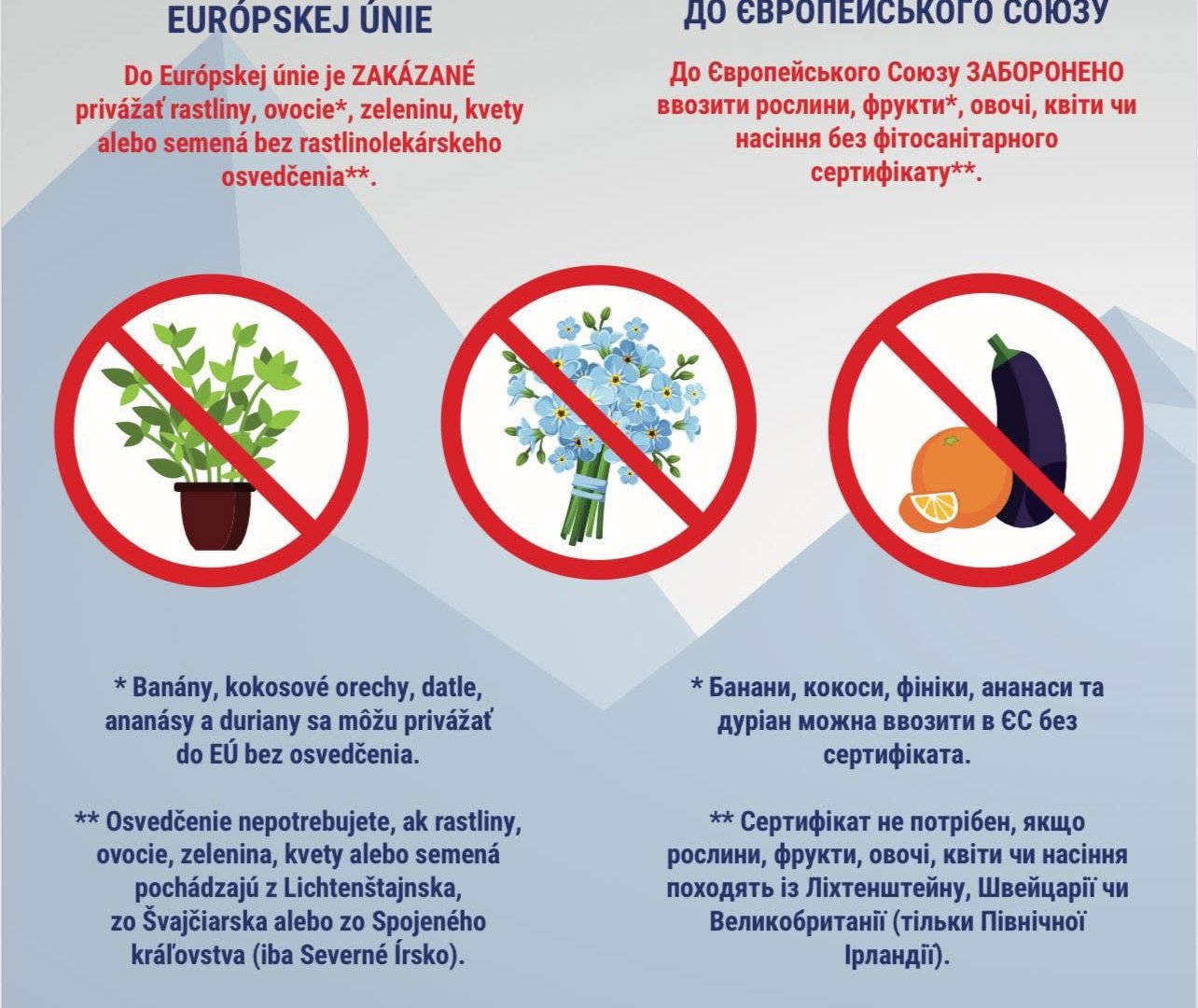 🌱 Без фітосанітарного сертифіката не можна ввозити рослини, фрукти, овочі, квіти та насіння. Виняток становлять лише банани, кокоси, фініки, ананаси та дуріан — їх можна ввозити без сертифікату. Сертифікат не потрібен, якщо рослинна продукція походить з Ліхтенштейну, Швейцарії або Північної Ірландії.