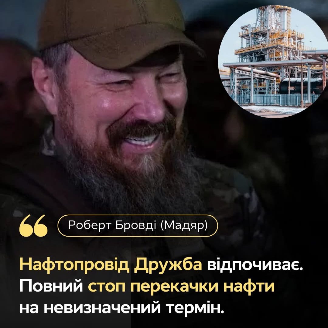 Командувач Сил безпілотних систем ЗСУ Роберт Бровді, відомий за позивним Мадяр, підтвердив успішну атаку українських дронів на один із ключових елементів російської нафтотранспортної інфраструктури — нафтопровід "Дружба", що проходить через Тамбовську область. Цей об'єкт має стратегічне значення для експорту нафти до країн Європи, зокрема до Угорщини, Чехії та Словаччини.