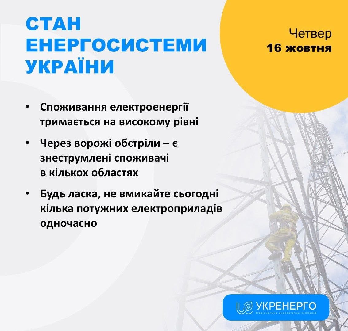 За інформацією «Укренерго», починаючи з 16:00 і до кінця доби сьогодні, 16 жовтня, по всій території України можливе застосування графіків обмеження потужності. Ці заходи стосуватимуться винятково промислових споживачів і можуть бути запроваджені обсягом до двох черг.