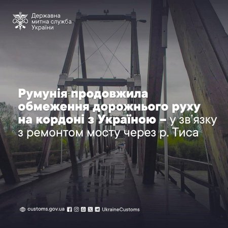 За інформацією відомства, автомобільний рух буде повністю закрито з 27 жовтня на 33 дні — у проміжок часу з 9:00 до 15:30. Обмеження діють для проведення ремонтних робіт інфраструктури мосту, що з’єднує українську та румунську частини кордону.