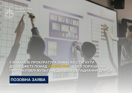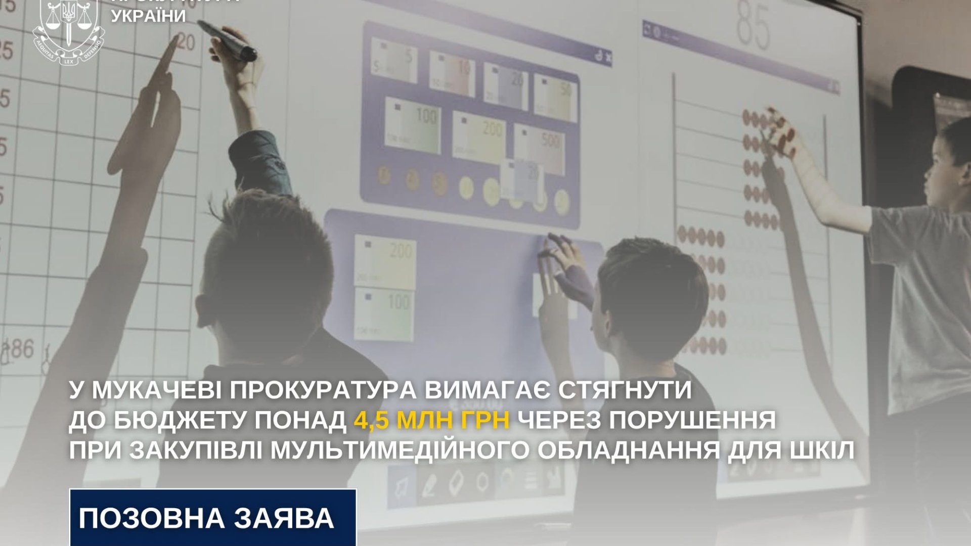 Мукачівська окружна прокуратура подала позов до Господарського суду Закарпатської області з вимогою визнати недійсними додаткові угоди до договору про закупівлю обладнання для шкіл та стягнути з постачальника понад 4,5 млн грн штрафних санкцій до бюджету.