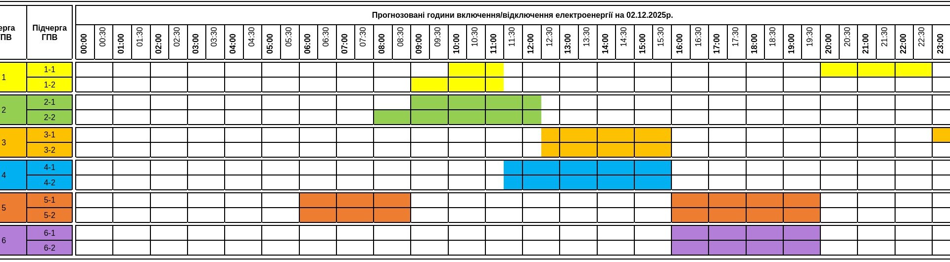 ПрАТ «Закарпаттяобленерго» інформує споживачів про необхідність застосування графіків погодинних включень/відключень електроенергії на вівторок, 2 грудня 2025 року.