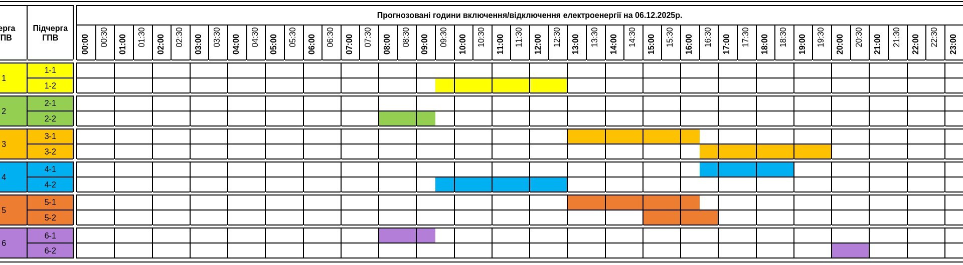 ПрАТ «Закарпаттяобленерго» інформує споживачів про застосування графіків погодинних включень/відключень електроенергії на суботу, 6 грудня 2025 року.